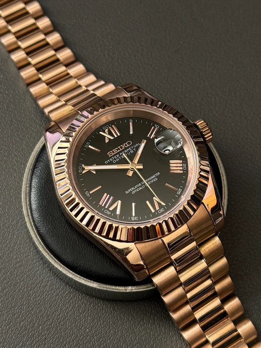 Seikmod Rosé Gold Sunflare NH35 I schwarzes Zifferblatt mit Presidential-Armband