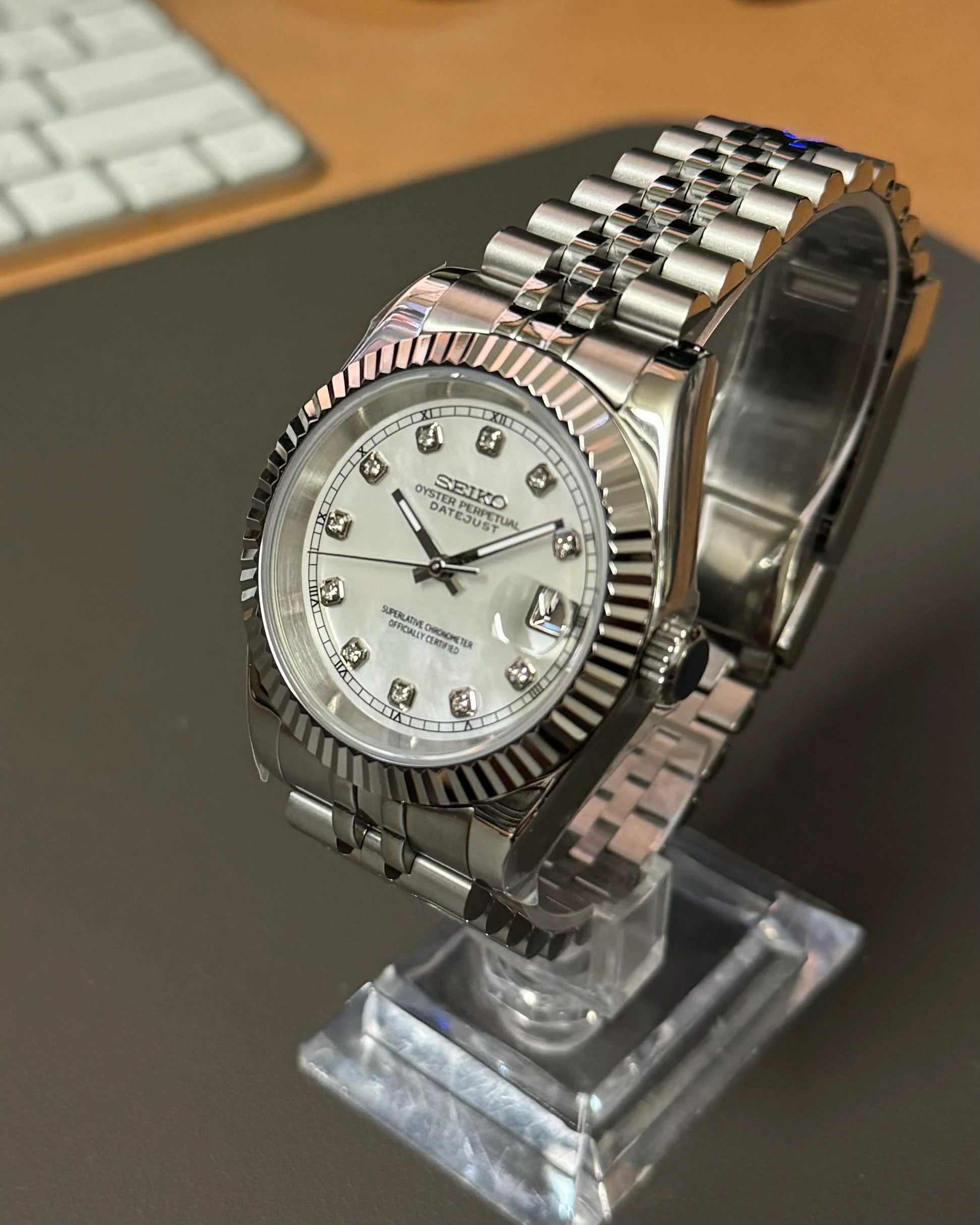 • Seikmod NH35 Uhrwerk mit Schnellverstellung für das Datum