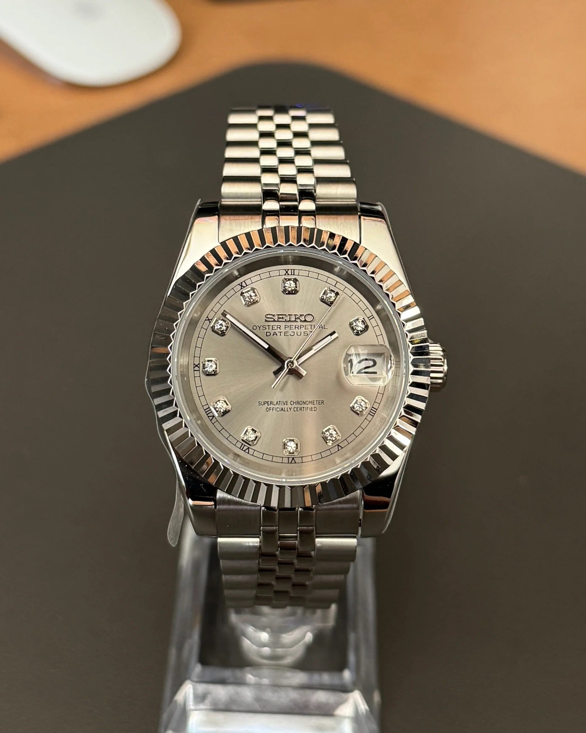 • Seikmod NH35 Uhrwerk mit Schnellverstellung für das Datum