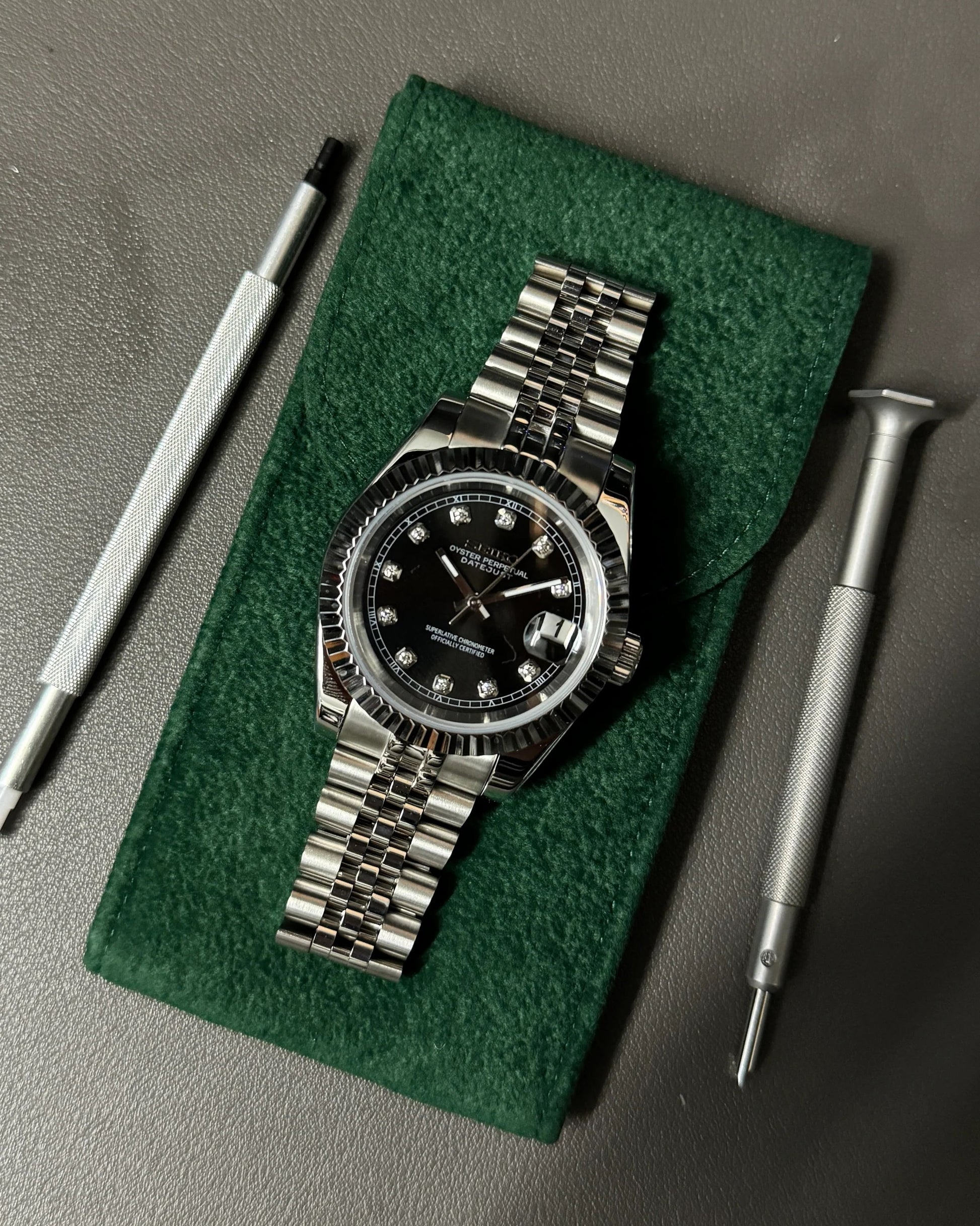 Wir empfehlen, deine Uhr regelmäßig mit einem weichen Tuch zu reinigen und sie vor starken chemischen Reinigungsmitteln zu schützen. Automatikwerke bleiben am zuverlässigsten, wenn die Uhr regelmäßig getragen oder in einem Uhrenbeweger aufbewahrt wird.